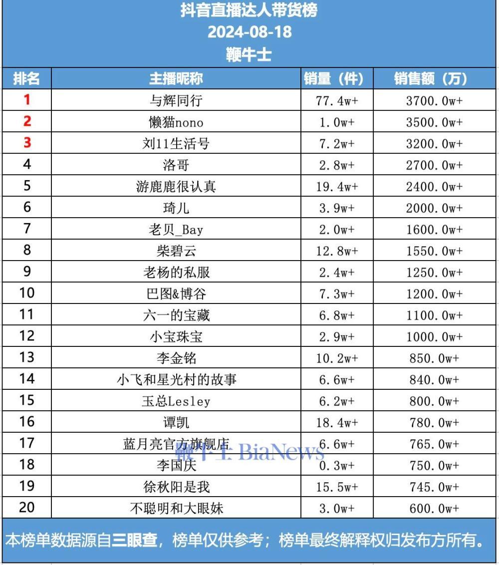 以下为8月18日抖音平台达人带货情况排名: