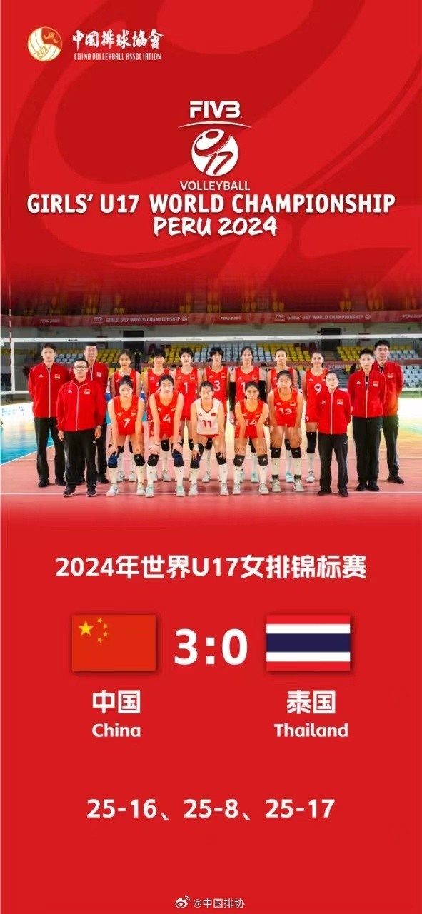 2024年世界U17女排锦标赛在秘鲁利马结束小组赛前两轮的争夺。在第一轮中,中国队3比0战胜泰国队获得开门红,三局比分为25-16、25-8、25-17。