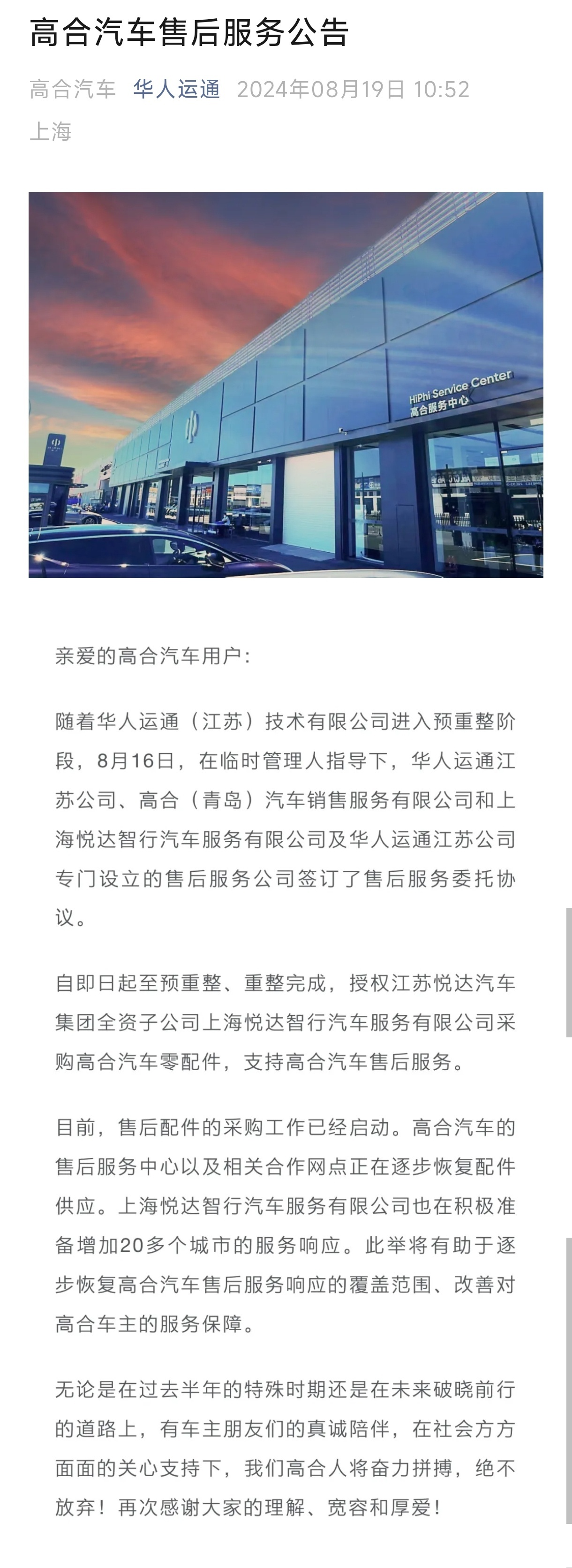 8月19日,高合汽车母公司华人运通(江苏)技术有限公司(简称“华人运通江苏公司”)发布公告,宣布自即日起授权江苏悦达汽车集团全资子公司上海悦达智行汽车服务有限公司采购高合汽车零配件,支持高合汽车售后服务。