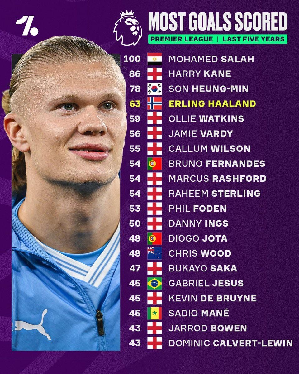 媒体统计了过去五个赛季英超联赛的总射手榜,萨拉赫100球排名第一,去年夏天已经离开托特纳姆热刺的哈里-凯恩86球排名第二,孙兴慜78球排名第三,2022年夏天才加盟曼城的哈兰德63球排名第四。