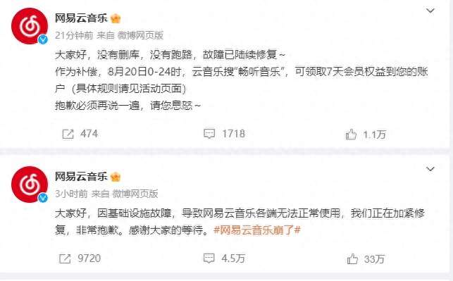 网易云音乐微博公布最新补偿方案:8月20日0-24时,云音乐搜“畅听音乐”,可领取7天会员权益到您的账户(具体规则请见活动页面)。