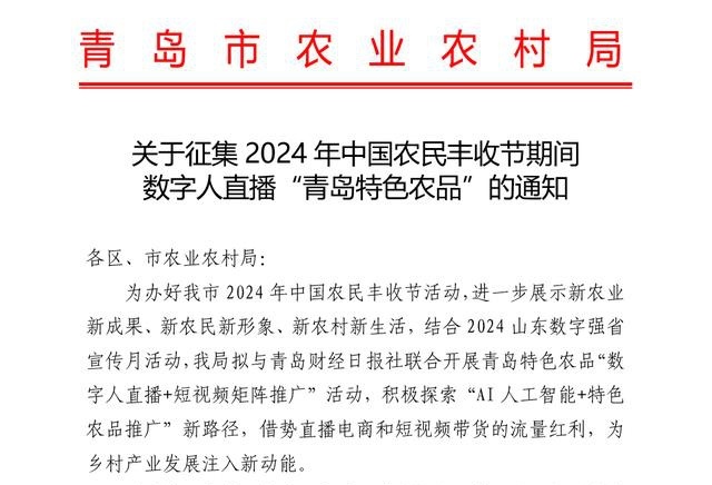 青岛特色农品“数字人直播+短视频矩阵推广”活动,是青岛市2024年中国农民丰收节的内容之一,也是结合2024山东数字强省宣传月活动而推出,将是兼备经济效益与社会效益的创新之举。