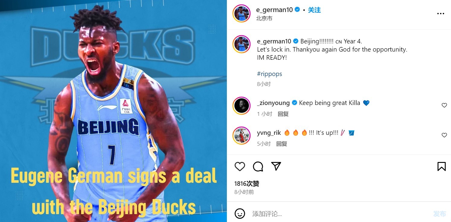 前CBA福建男篮外援尤金-杰曼更新个人社媒,宣布自己已经签约北京男篮。