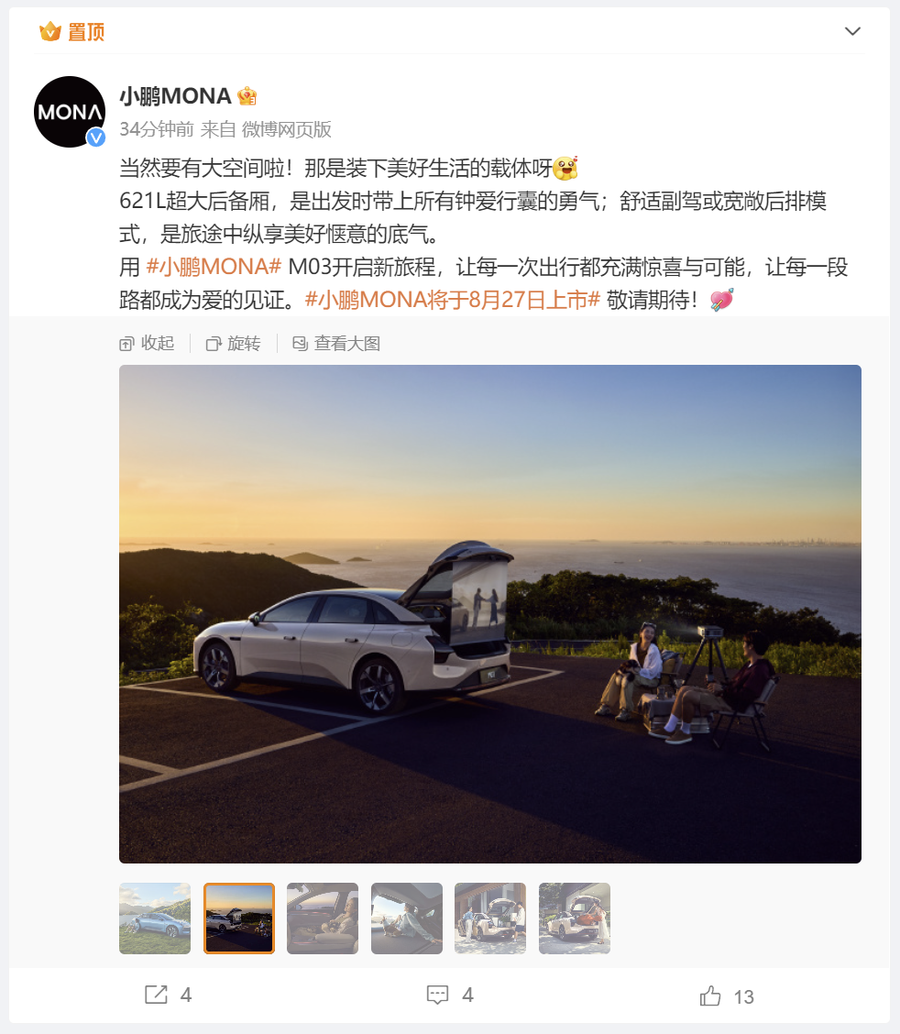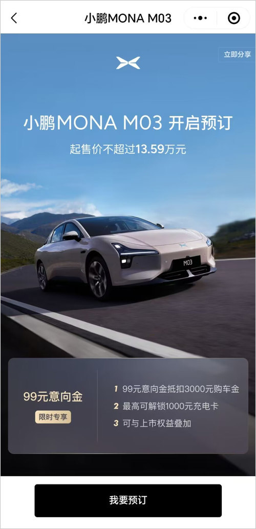 来自小鹏汽车官方微博的重磅消息。小鹏MONA M03将于8月27日上市。目前这款新车已开启预订,起售价不超过13.59万元,现支付99元意向金,可享受多重购车福利,包括99元意向金抵扣3000元购车金,至多可解锁1000元充电卡,可与上市权益叠加。对这款新车感兴趣的朋友们可以前往各地的小鹏汽车门店看车。