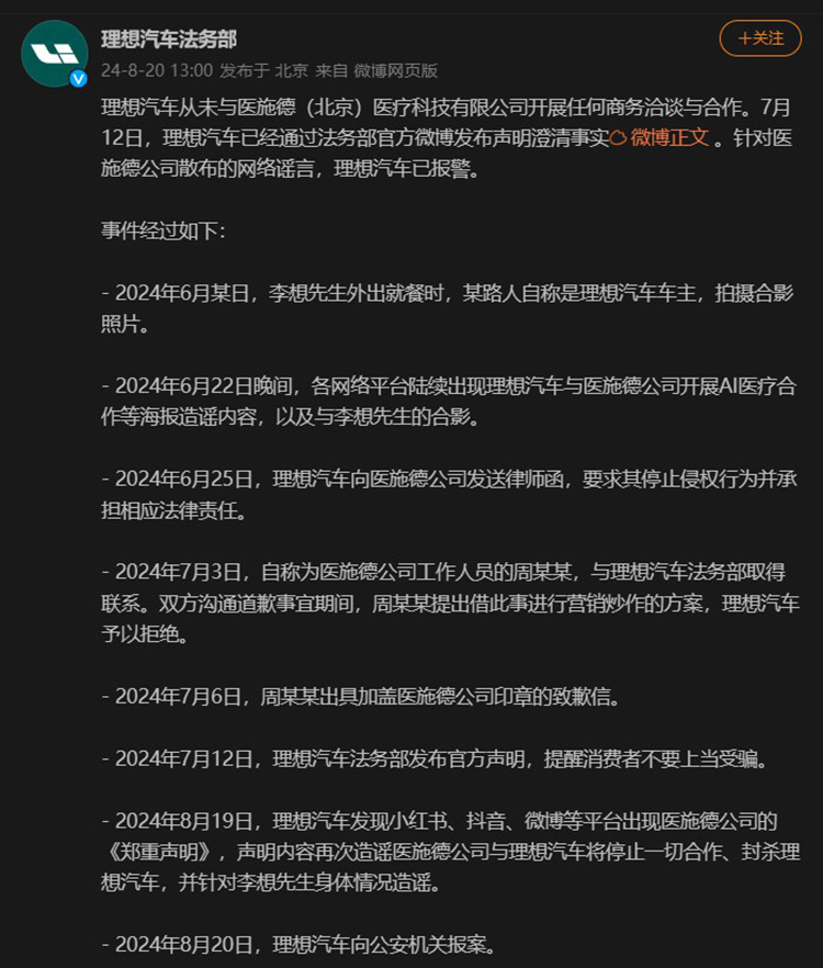 医施德与理想汽车的纠葛发生自今年6月的某日,据理想汽车法务部微博梳理的时间线可知,当日李想外出时遇到一名自称理想车主的路人,两人进行了合影。而后网上就出现了理想汽车与医施德公司开展AI医疗合作等海报造谣内容,并配上了合影照片。