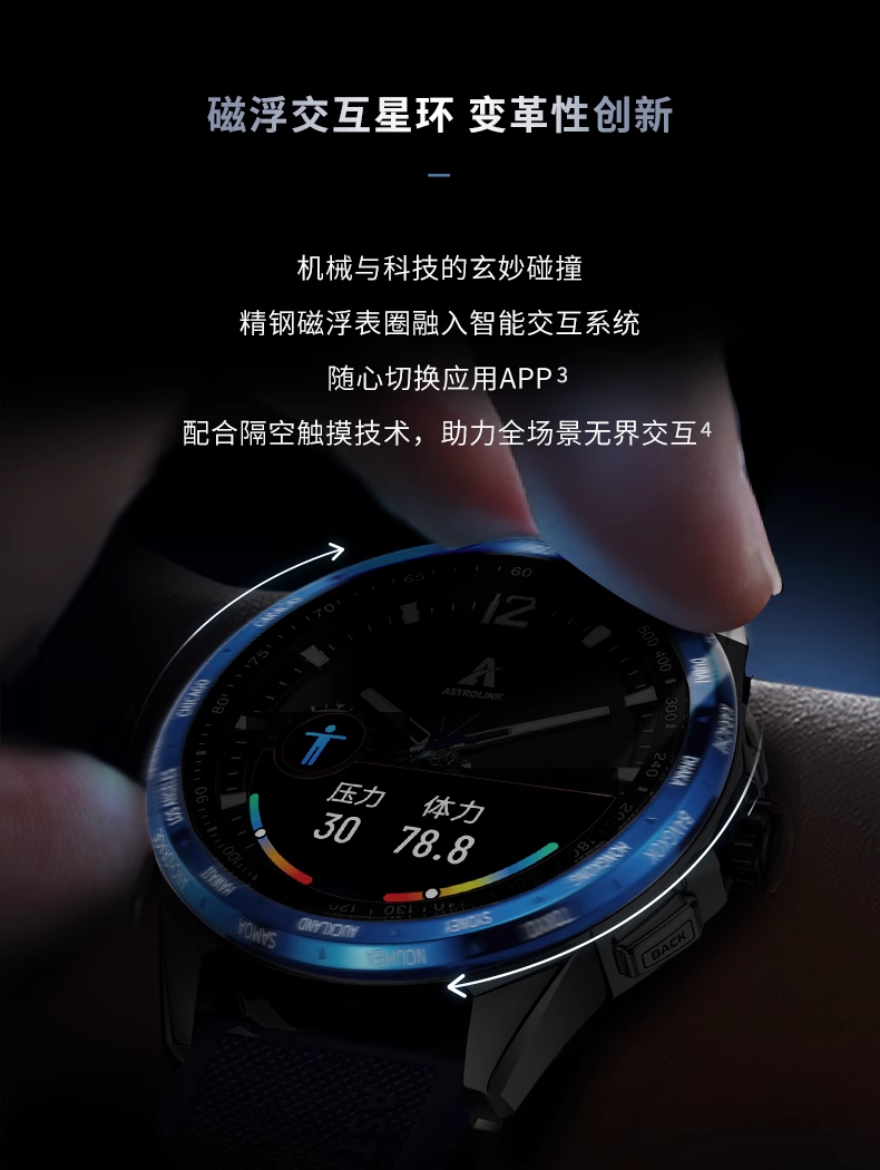 北斗手表 Astrolink S 在外观方面也搭载了不少有趣的设计,比如有一个精钢打造的磁浮交互星环,能支持隔空触摸技术,侧面有一个旋转表冠和两个按键;内部还搭载了世界超微缩大扭矩电机和光电伺服高精度齿轮系统,保障实体机械指针的准确运行。
