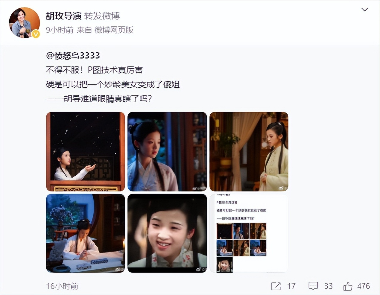 针对张淼怡被嘲“丑”,导演胡玫曾多次发剧照力挺演员,并称有人恶意丑化张淼怡。