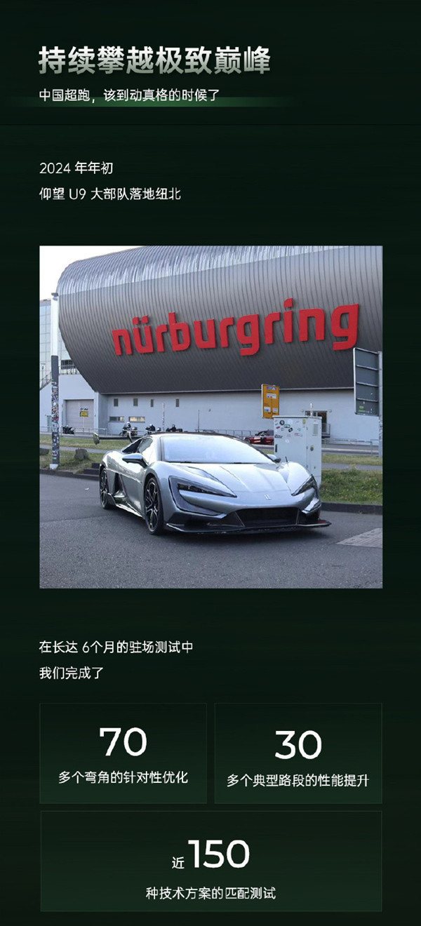 仰望官方也透露了此次纽北之行的部分幕后故事。仰望U9早在年初就已经前往纽北,在长达6个月的驻场测试中,仰望对测试车辆进行了70多个弯角的针对性优化、30多个典型路段的性能提升、150种技术方案的匹配测试,可以说为了最终的圈速测试做足了准备。