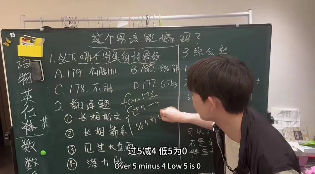 “这个男人能嫁吗?”也成为现在短视频平台上的新内容方向。“旺旺表弟”“探长杰森”“马达情感分析”这些博主开始用老师讲课的方式,逐字逐句翻译相亲市场的男嘉宾个人条件,并分析其背后的“潜台词”,比如“旺旺表弟”就总结了“过五减四,低五为零”的男人身高公式。
