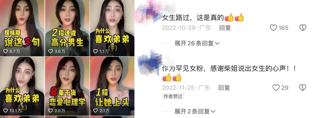 也有少部分女性博主开始从女性视角出发,为男性用户答疑解惑。比如号称要“做最高级的男性情感”的博主“你的柴姐”,会在短视频中分享“3步撩妹让她主动”“2招速成高分男生”“男生做什么会很加分”“征服高分女生”。评论区也都是“柴姐YYDS”“我是女生,说得很对”。