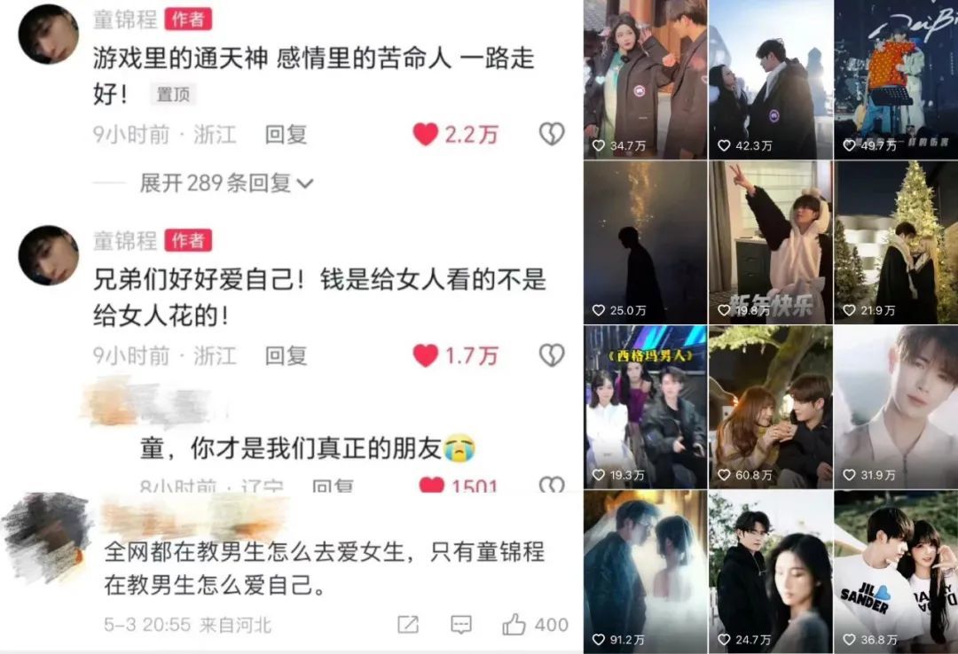 而童锦程也没有让“兄弟”们失望,不仅在视频中带出一个又一个颜值博主进行互动,还输出了包括“钱是让女人看的,不是给女人花的”等直到现在还广为流行的“情感语录”,并被不少“兄弟”们奉为圭臬。