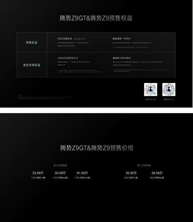 目前,腾势Z9GT与Z9正式开启预售,预售价格区间为33.98万~41.98万元。其中,腾势Z9GT与Z9插混版车型预售价格为33.98万~41.98万元;纯电版车型预售价格为35.98万~38.98万元。