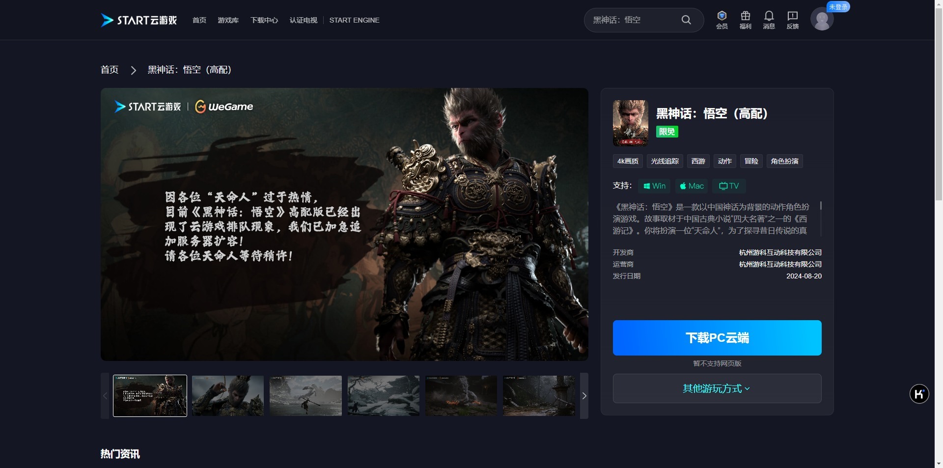 目前START云游戏的服务器也已经爆满,连云游版本的《黑神话:悟空》都需要排队游玩,可见这一现象级的国产3A大作的人气确实十分高。