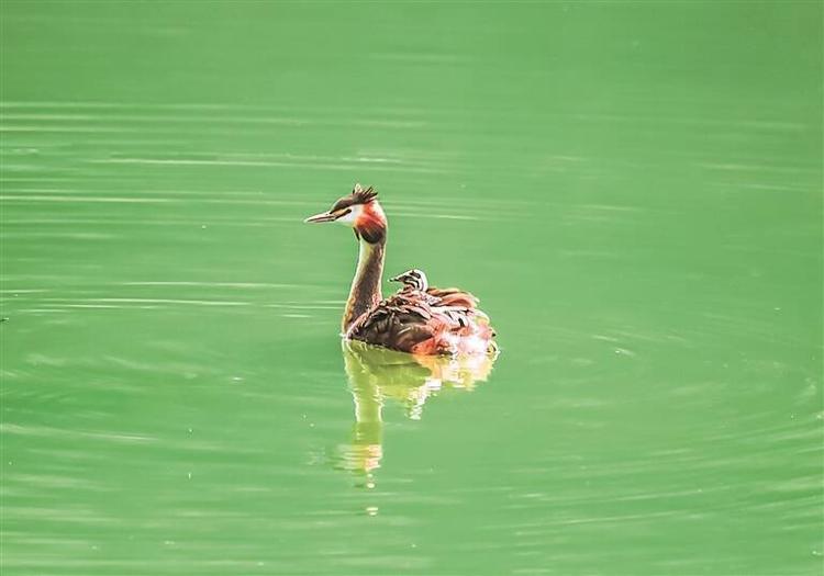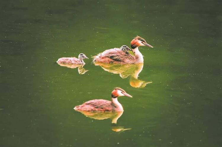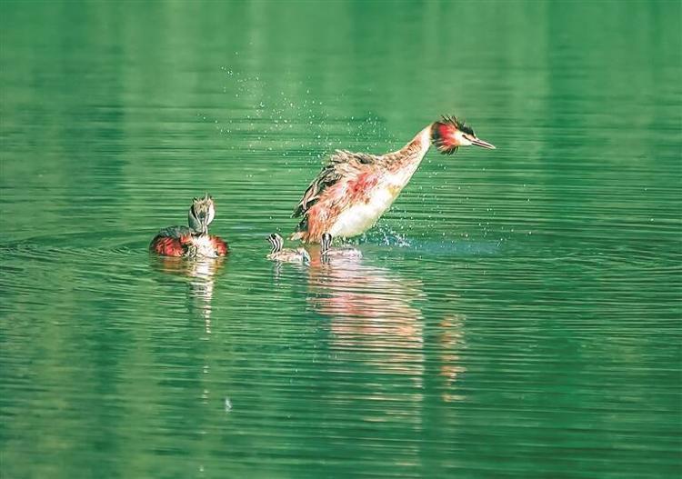 近日,在潍坊青州尧王湖,摄影爱好者拍摄到国家二级保护动物、入选濒危物种红色名录的风头䴙䴘。一家四口,两只成鸟两只雏鸟,在湖面上享受惬意的亲子时光。