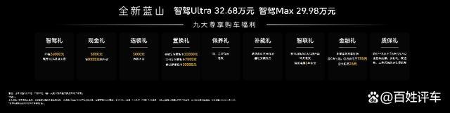魏牌全新蓝山推出智驾Max版、智驾Ultra版两个版本车型,官方售价分别是29.98万元与32.68万元,还准备了9大尊享购车福利,购车权益包括:智驾礼(价值26000元城市NOA智驾功能终身免费),现金礼(5000元抵8000元购车款),选装礼(5000元选装基金),置换礼(魏品牌车主置换享30000元,长城品牌置换享10000元,其他品牌置换享7000元),以及超值的金融礼、补能礼、智联礼、保养礼、质保礼。起步即拉满,智享新豪华。