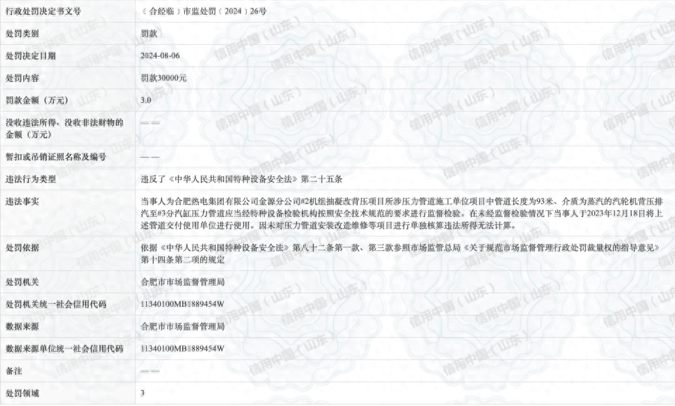 据行政处罚决定信息公开表显示,中国电建集团核电工程有限公司为合肥热电集团有限公司金源分公司#2机组抽凝改背压项目所涉压力管道施工单位项目中管道长度为93米、介质为蒸汽的汽轮机背压排汽至#3分汽缸压力管道应当经特种设备检验机构按照安全技术规范的要求进行监督检验。在未经监督检验情况下中国电建集团核电工程有限公司于2023年12月18日将上述管道交付使用单位进行使用。因未对压力管道安装改造维修等项目进行单独核算违法所得无法计算。