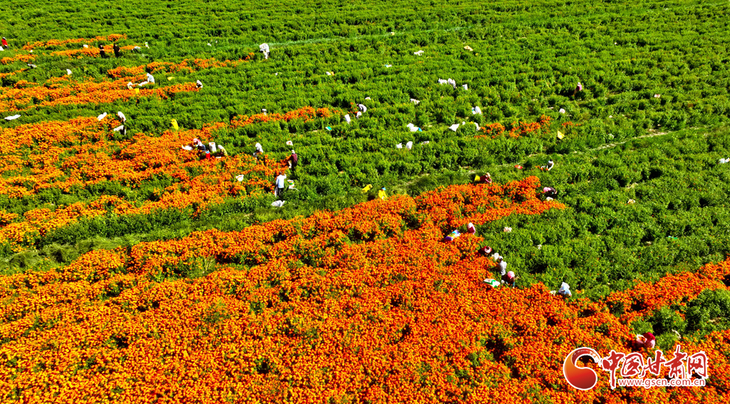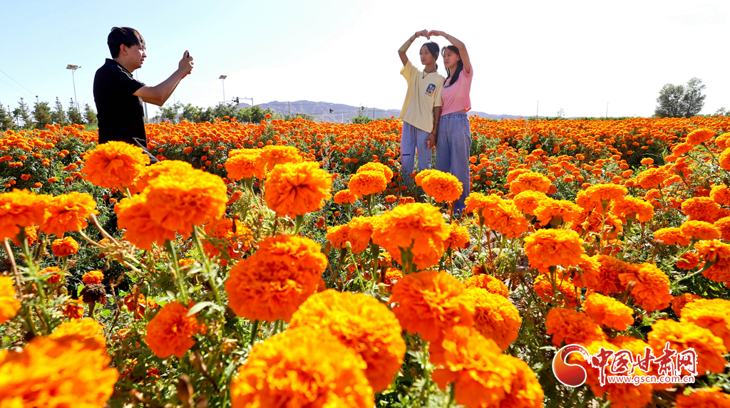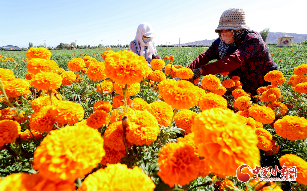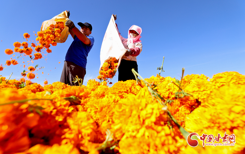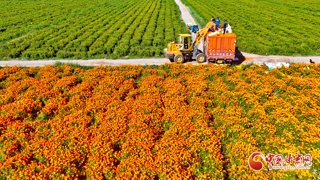 8月21日,山丹县清泉镇双桥村如意花海万寿菊种植基地内,花农们正在将采摘的万寿菊装车,准备运往加工厂。游客们也络绎不绝地来到金色花海,同美丽的花朵合影,留下秋日最美妙的记忆。