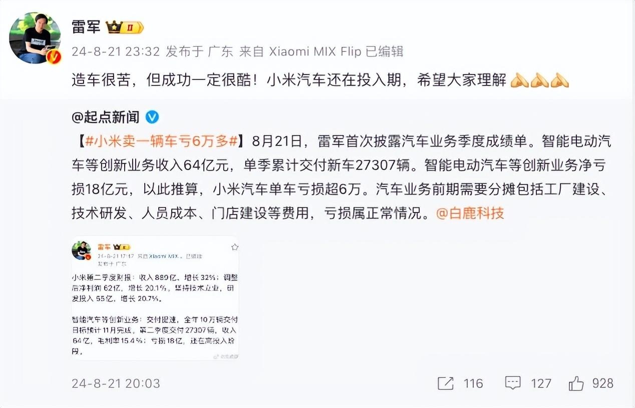 8月21日,雷军首次披露汽车业务季度成绩单,随后“小米卖一辆车亏6万多”相关话题登上热搜。22日的直播中,雷军再度回应小米汽车每卖一台车亏6万。