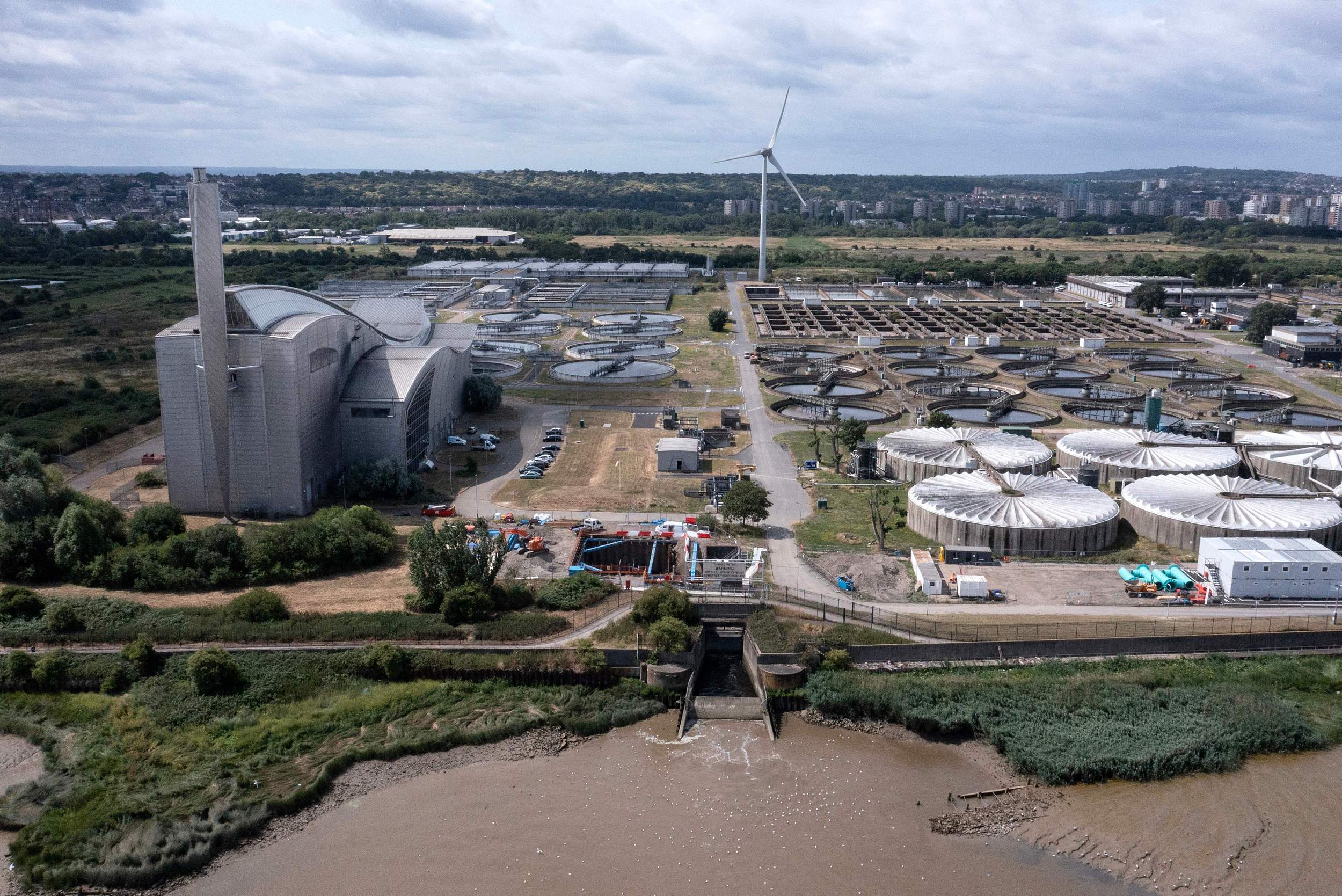 2023年7月3日,英国伦敦泰晤士河河岸,鸟瞰泰晤士水务公司污水处理厂。