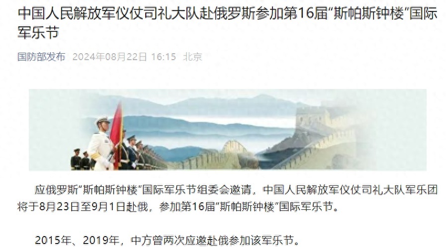 8月22日,据国防部发布:应俄罗斯“斯帕斯钟楼”国际军乐节组委会邀请,中国人民解放军仪仗司礼大队军乐团将于8月23日至9月1日赴俄,参加第16届“斯帕斯钟楼”国际军乐节。