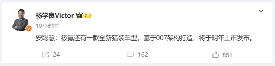 来自浙江吉利控股集团高级副总裁杨学良个人微博的消息。极氪将于2025年推出新款猎装车型,基于极氪007架构打造。