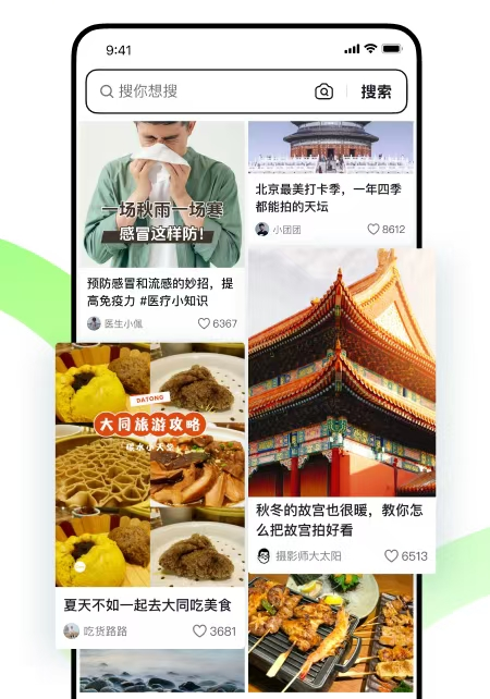 进入 App 后,可以看到搜索栏和双列瀑布流展示下推荐内容。
