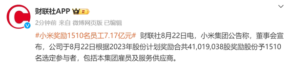 【CNMO科技消息】8月22日晚,CNMO了解到,小米集团公告称,董事会宣布,公司于8月22日根据2023年股份计划奖励合共41,019,038股奖励股份予1510名选定参与者,包括本集团雇员及服务供应商。