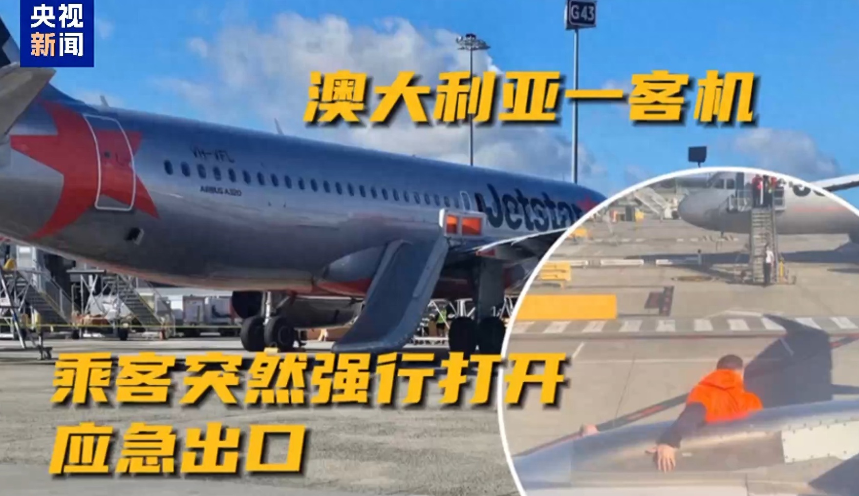 当地时间8月22日,澳大利亚墨尔本机场发生一起意外事件。澳大利亚捷星航空公司从悉尼起飞的JQ507航班刚刚着陆并滑行至航站楼。此时,机上一名男子突然强行打开机身右侧的应急出口,救生滑梯自动展开。可这名男子在冲出应急出口后并未使用滑梯,而是沿着机翼行走,最后顺着机翼下的发动机滑至地面。他随即便被机组人员和地勤人员控制住。