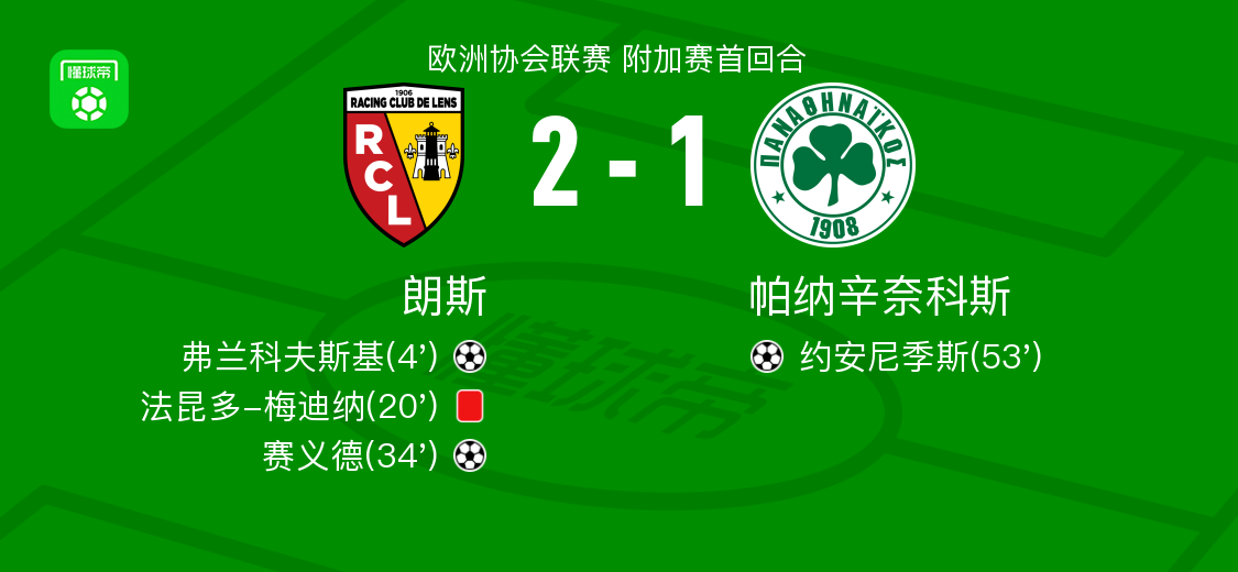 在欧洲协会联赛附加赛首回合的较量中,朗斯迎战帕纳辛奈科斯。比赛一开始,朗斯的索托卡助攻弗兰科夫斯基率先破门,为球队取得领先。随后,朗斯的法昆多-梅迪纳因犯规被罚下场,球队陷入被动。然而,朗斯并未因此气馁,赛义德在一次进攻中成功破门,再次扩大了领先优势。 下半场,帕纳辛奈科斯展开反击,科茨拉斯助攻约安尼季斯扳回一城。尽管帕纳辛奈科斯奋力追赶,但最终未能改写比分。比赛结束,朗斯以2-1战胜帕纳辛奈科斯,取得了首回合的胜利。