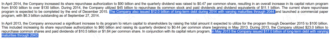 2013年,苹果发行了170亿美元的长久期债券。2014年,苹果继续发行了120亿美元的长久期债券。这些债券的到期时间各不相同,最长的要到2044年才到期——也就是30年以后。