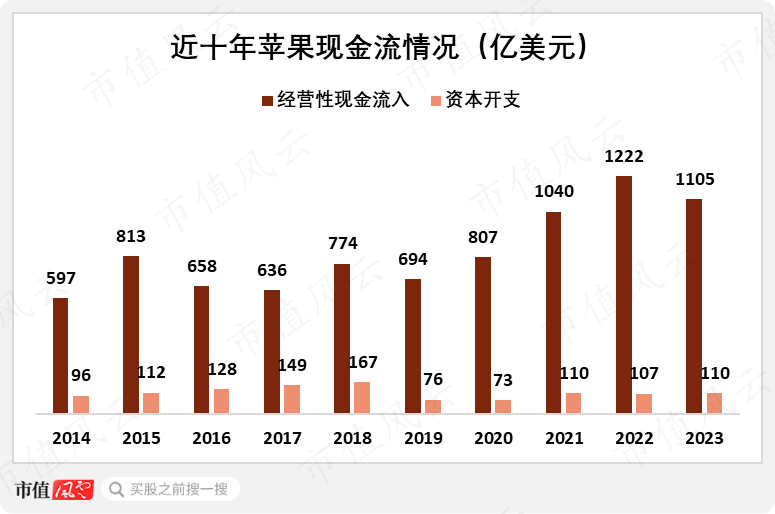 而当年,苹果经营活动产生的现金流入达到597亿美元,随着经营状况向好,苹果的经营性现金流入持续增加,最近三年都在千亿美元/年以上。同期,苹果的资本开支最多的一年也不超过200亿美元,换句话说,苹果根本不缺钱。