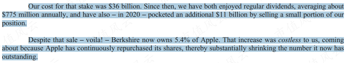 据伯克希尔在2020年财报中披露,其购买苹果股份的成本大概是360亿美元,从2016年末到2022年末(此后未披露),苹果每年分给伯克希尔的股息大约是7.8亿美元。2020年,伯克希尔还通过小比例减持,套现110亿美元。