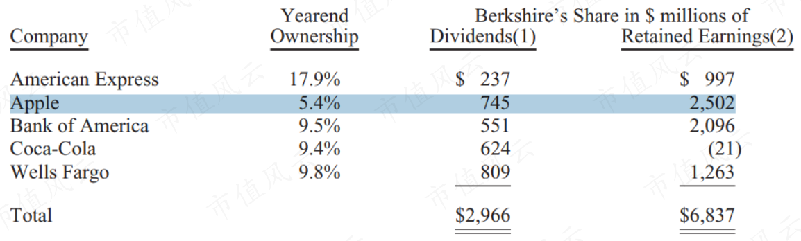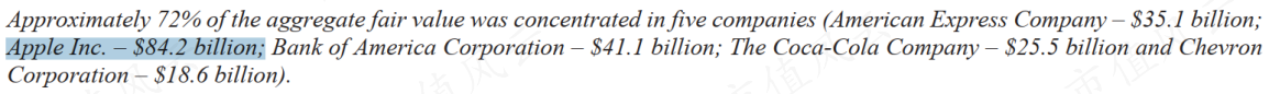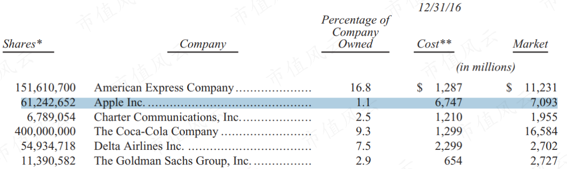 在2016年年报中,苹果出现在伯克希尔的前十大持仓中,截至当年12月末,伯克希尔持有苹果1.1%的股份。