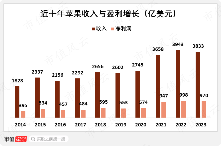 这个黏性十足的业务生态确实极具变现能力。近十年,苹果的收入由2014年的1828亿美元增长至2023年的3833亿美元,CAGR为9%;同期,净利润由395亿美元增长至970亿美元,CAGR为10%。