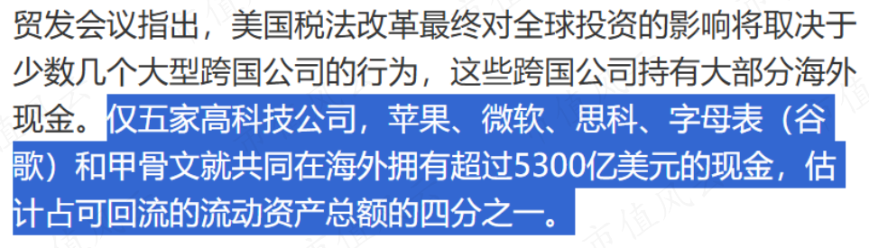 2016年之前,美国跨国企业只有将海外赚取的利润汇回美国时,才需要缴税。这促使美国跨国企业更倾向于将利润保留在海外的一些“避税天堂”,比如百慕大、爱尔兰等等。