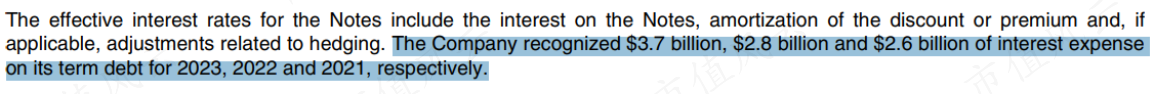 根据苹果在2023年报中披露的过去三年的利息支出,我们可以推算,其上千亿美元长期债务的整体成本率大概不超过3%。