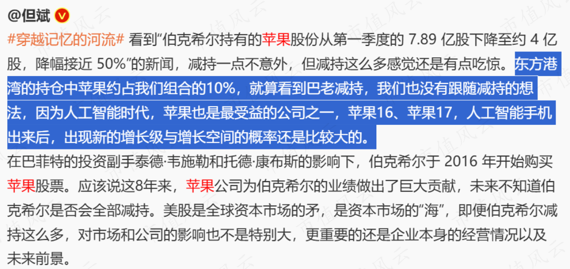 国内价投代理人之一的但斌就表示:“就算巴菲特减持,我们也没有跟随减持的想法,人工智能时代,苹果也是最受益的公司之一……美股是全球资本市场的矛,是资本市场的海……更重要的还是企业本身的经营情况以及未来前景。”