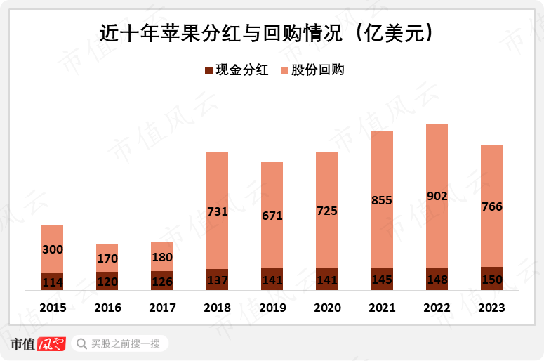 苹果的现金分红一直表现稳定,从2015年开始随着经营状况提升,其现金分红规模逐年递增,由2015年的114亿美元提升至2023年的150亿美元。