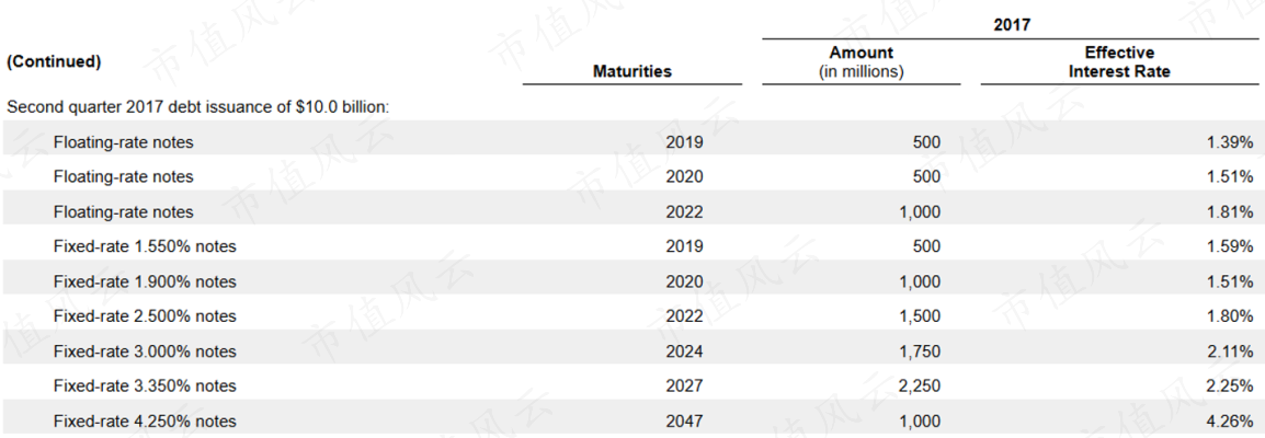 从苹果这上千亿美元的定期债务结构来看,由于期限不同,对应的利率水平也不同,苹果披露的利率范围大概在1.4%-4.3%这个区间。
