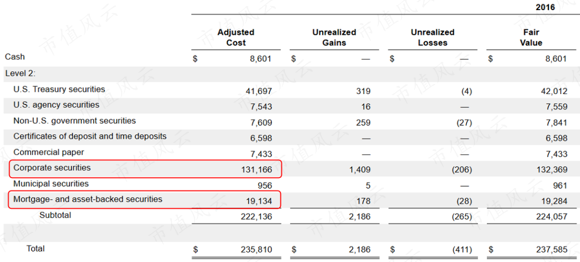 早在2016年,苹果持有的公司债券规模就超过了1300亿美元,其企业债+ABS/MBS规模合计超过了1500亿美元。
