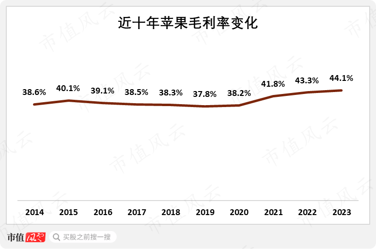 在软硬件业务的共同推动下,苹果的综合毛利率在2023年达到44%,较2014年提高了5.5个百分点。