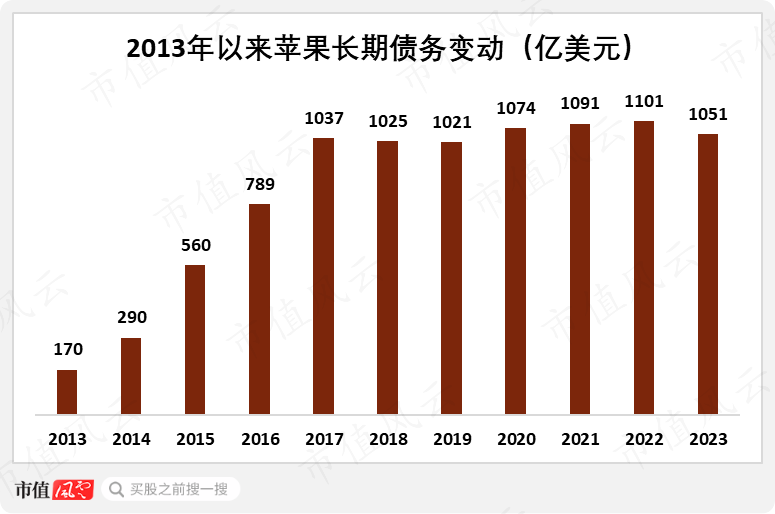 从2013年开始,苹果此后5年里平均每年都发行超过200亿美元的长期债券,到了2017年,其长期债务规模达到1037亿美元,截至2023年末,其长期债务还保持千亿美元的水平。