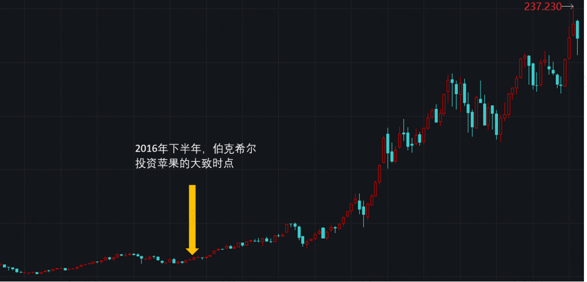 伯克希尔对于苹果的投资始于2016年。据说,是巴菲特的两位接班人首先买入了小仓位苹果股票,后得到巴菲特的批准后,伯克希尔开始大举建仓。