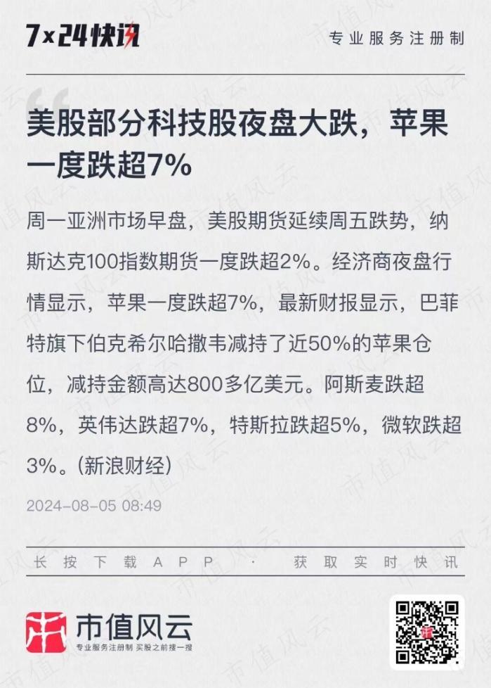 2024年8月5日,全球股市迎来“黑色星期一”,日经股指熔断暴跌,美股三大股指均大跌3%左右,美股科技7巨头多数大跌,其中之一的苹果(AAPL.O)一度跌超7%。