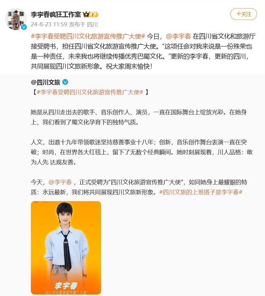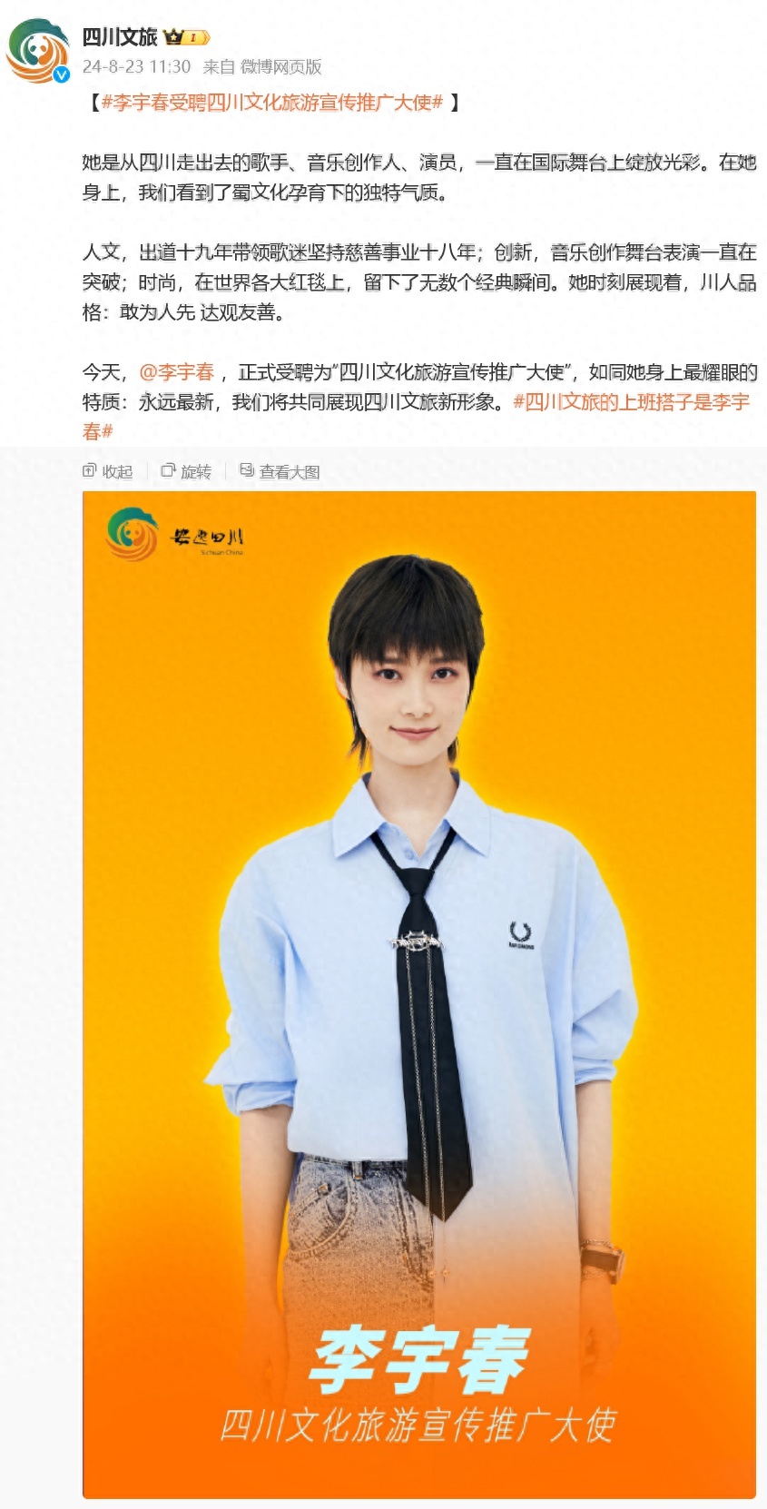 8月23日,据四川文旅消息,李宇春受聘四川文化旅游宣传推广大使。