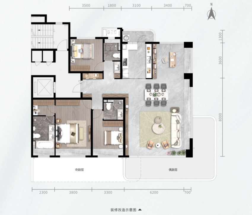143㎡【浮光|四室两厅两卫】的起步房源面积,设定高端居住门槛,确保了居住圈层的纯粹与尊贵。约50㎡LDKG一体化方厅,约30㎡南向奢华主卧套,加上约8.8米跑道式双跨阳台+南向超大露台,空间奢阔尺度感超绝;全屋收纳空间预留、S墙设计元素等细节,最大限度将房屋内的空间利用率做到极致。
