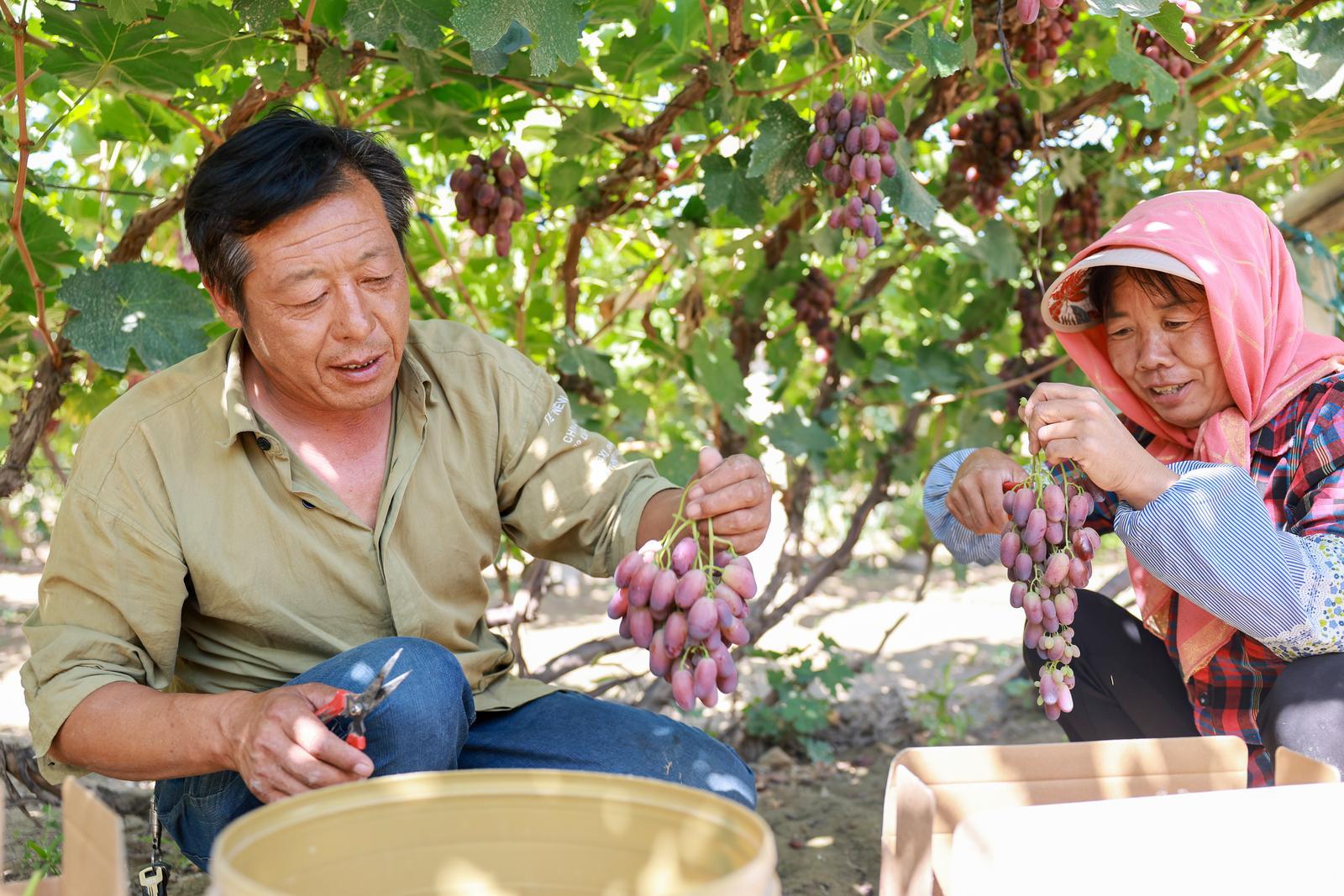 “今年我种的葡萄主要品种有蓝宝石、维多利亚、里扎马特,总共有六亩多地,现在正是采摘的丰产期,价格在6到8元之间,九月底可以全部采摘完,大概能收入五万多块钱。”金塔县羊井子湾乡大泉湾村果农魁崇虎说。