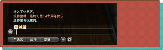 在本次国服十周年活动的第一阶段,各位冒险者大人可在任意游戏主城使用喊话频道,喊话内容包含以下文字:最终幻想14十周年快乐!并做出高兴的情感动作(在对话框输入:/高兴 或在情感动作中使用高兴的情感动作。)如下图所示,即算完成第一阶段任务。