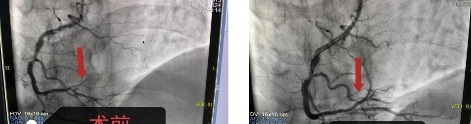 入院后立即予以完善心电图,显示ST段抬高心肌梗死。完善抽血检查后考虑急性心肌梗死超急性期。心血管内科二区副主任李贺跟家属充分沟通后,予以完成冠脉造影,造影结果显示:左前降支狭窄90%,左回旋支狭窄95%,右冠近端狭窄70%远端闭塞。属于冠心病中较严重的三支病变。