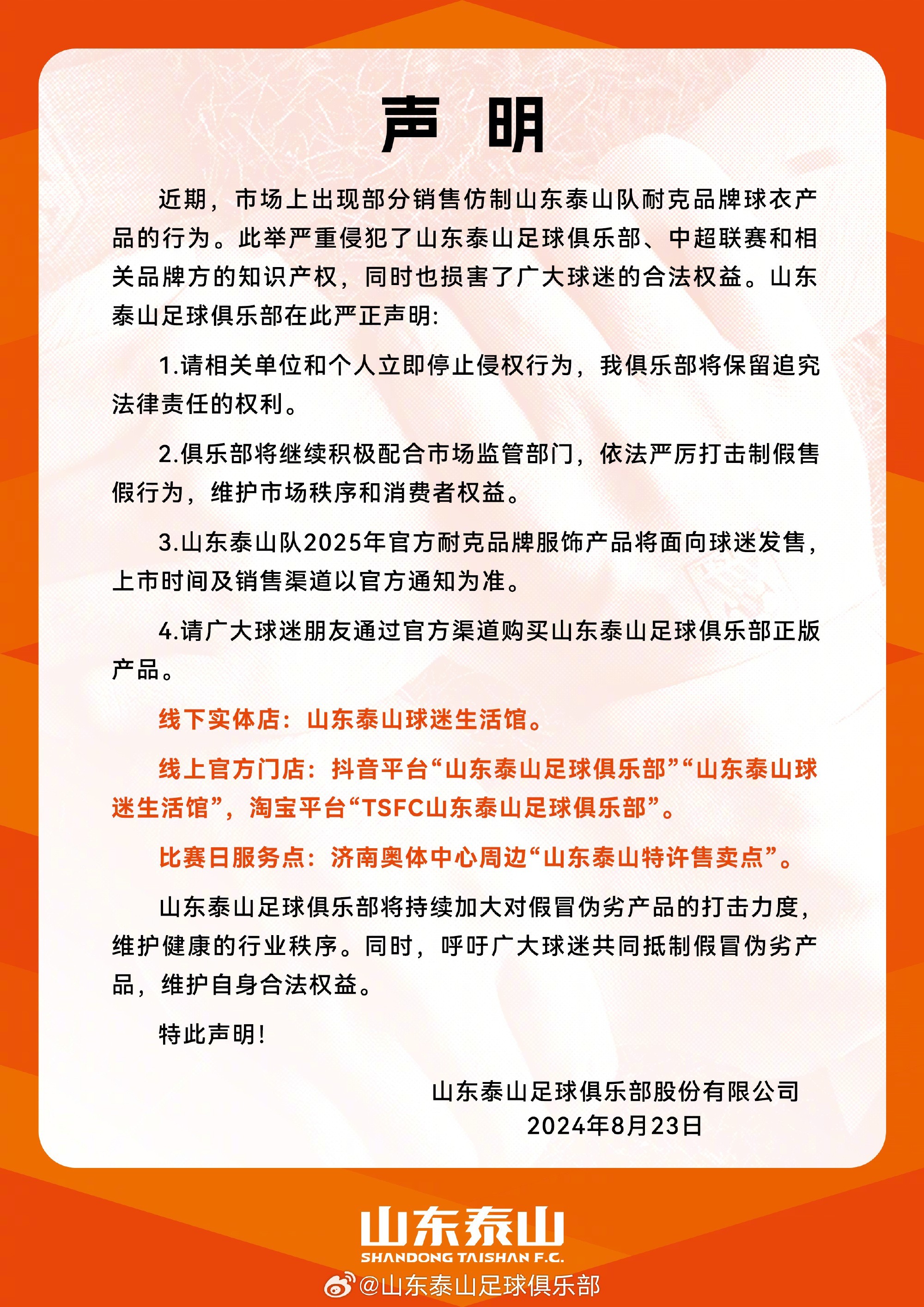 8月23日,山东泰山官方发布声明,打击售卖盗版球衣的行为。